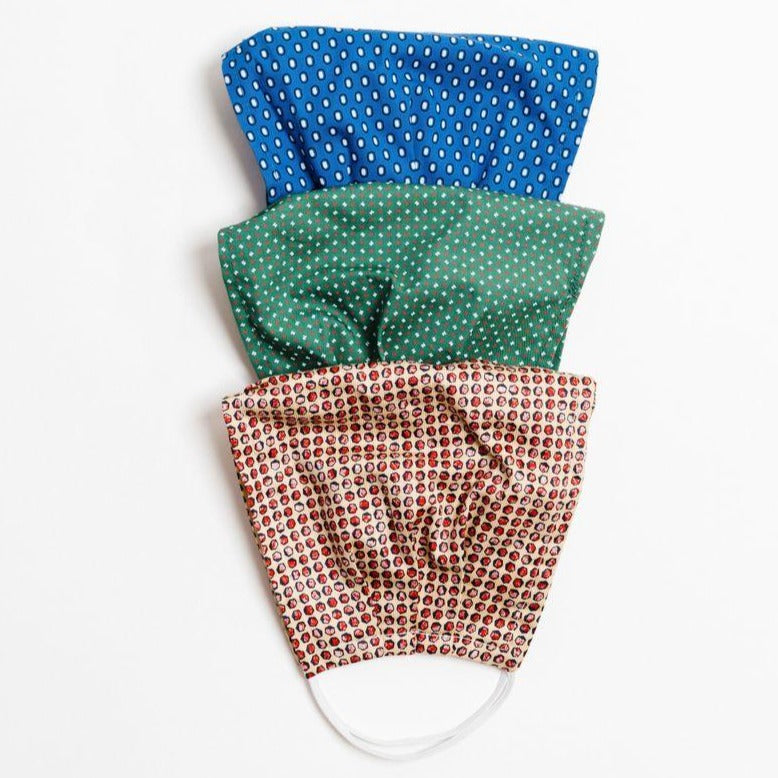 This collection includes three separate masks. Each mask is washable, reusable, 100% cotton masks are made of double-layered cotton with fine, detailed stitching. Elastic straps to secure behind your ears. These masks are the perfect item to keep in your car for the whole family to use during cold and flu season, cleaning dusty rooms, or airplane travel.